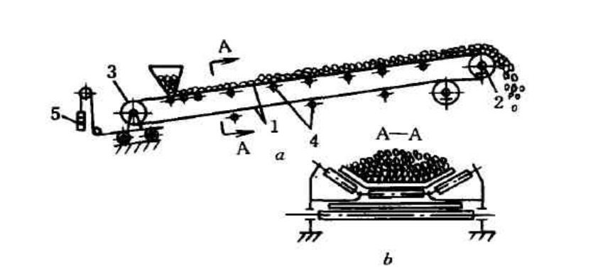 (2) Băng chạy trên con lăn cùng với tải trọng hàng hóa. Băng vừa là cơ chế lực kéo vừa là máy mang theo